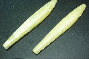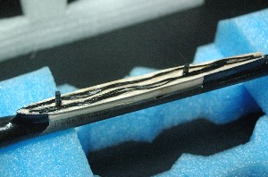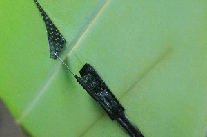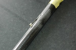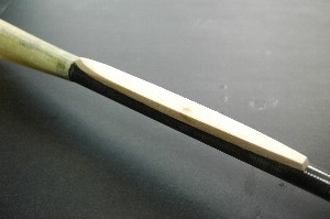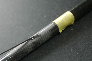 取り出したマイクロカーボンパイプを必要な長さにカットして、先端に内径1.2ミリのPPパイプを被せます。 マイクロカーボンパイプの端部は無理な力が加わると簡単に割れてしまいますのでこうして保護しておきます。 |