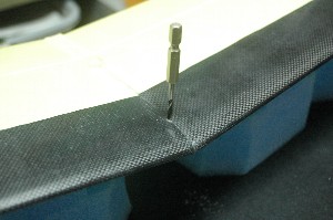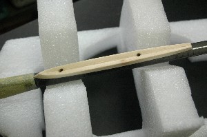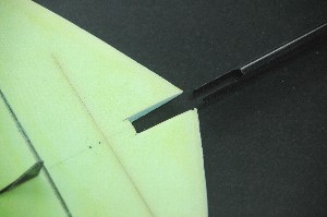 3ミリのカーボンロッドを固定ピンとして挿入します。 主翼に3ミリの穴を開けます。最初に1ミリのドリルで慎重に真直ぐな穴を開け、3ミリの木工用ドリルで3ミリの穴を開けます。 木工用ドリルは先端に細径のポイントが付いていますので、先に明けたガイド穴に従って穴あけが出来ます。 穴明け後、瞬間接着剤を流し込んで穴まわりのバルサを固めておきます。 |