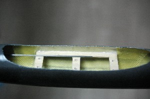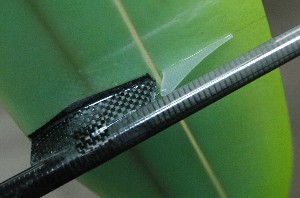 垂直尾翼も水平尾翼と同じマイクロカーボンパイプを内装します。 ホーンの穴からマイクロカーボンパイプの取出し穴までの距離が長くなりすぎました。ランチ時にラダーが振られるのを防ぐ為にカーボン板でスロープをつくりました。 マイクロカーボンパイプ端部の割れ止めとしてシュリンクチューブで保護しています。 |
