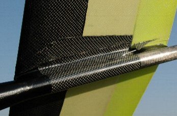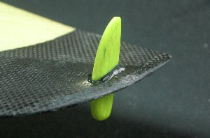 イエローに着色して主翼に取り付け。 ペグの付け根には大きな力が加わるので、カーボンロービングを添えてエポキシでフィレット状にします。 恥ずかしながら最近知ったのですが、ペグは翼面に垂直に立てるのではなく、水平面に垂直・・つまり垂直尾翼と平行に立てます。 |