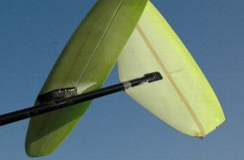 台座の取り付け。台座の平面型は翼型にして空気抵抗を減らします。 また、高さを最小限にしています。(エレベーターが10ミリ下がる分だけ)台座により尾翼が持ち上がっている分だけランチ時にブームが振られますのでこれを防ぐ為です。 前回は接着部のパイプの表面をペーパーで荒らしていなかったので接着が衝撃で外れてしまいました。今回はちゃんと荒して接着します。 |