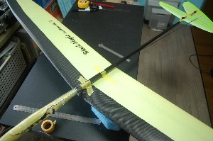 主翼ホーンの取り付け。 パイプに沿うように内傾させます。 |