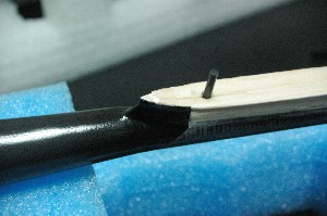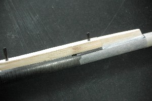 パイプはポッドに75ミリオーバーラップさせています。ランチ時にポッド部にかかる遠心力に対する補強として、パイプを出来るだけオーバーラップさせるようにしました。 このあとパイプとポッドの間にバルサを挿入します。これでポッド部の強度は十二分です。 |