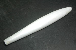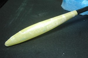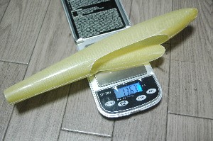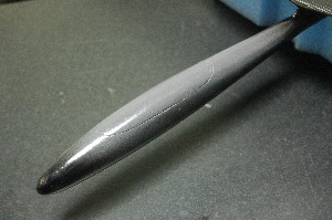 半硬化時点でバッグから取り出し、蓋のカットと、離型用のカットを入れます。 クリアファイルでバギングしたので表面はきれいに仕上がりました。クリアファイルの継ぎ目部分は厚み分段差が出来ていますのでサンディングが必要ですが、全体にスムーズに仕上がっていますのでサンディングは容易そうです。 先端部分はクリアファイルが3次元曲面に沿いきらず、ボコボコになってしまいました。あとで修正することににします。 |