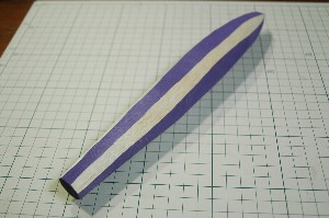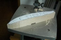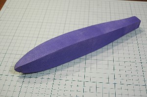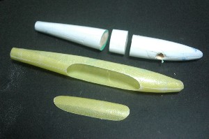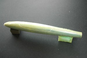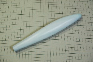 やり直しです。 3分割していた成形型を接着し一体にします。穴があいた部分をスクラップバルサで埋めて現状復帰。全体に「一回り小さく」削ります。 (ちょっと削りすぎたか?の感がありますが、続行することに) POD 1個目同様、サンドペーパーでスムースに仕上げて、サーフェイサーを吹き付けて仕上げ完了。 |