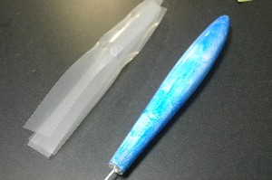 半硬化時点で取り出して、キャノピーを切り出します。(半硬化時点だとカッターでサクっと切れます) それから、硬化後に型を抜く為に「背割」を入れておきます。 |