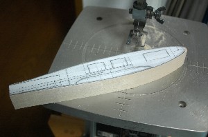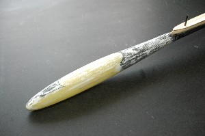 台座前縁側。写真は塗装後。塗装していない部分はあとでカーボンを貼ります。 台座の先端部は船の船首のような形に整形しました。 これなら空気抵抗が減るでしょう。 3ミリのカーボンピンは台座に接着してあります。 |