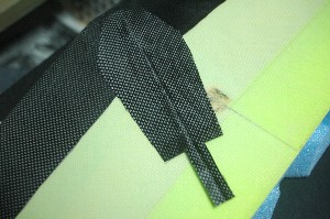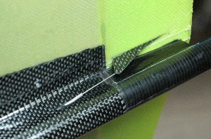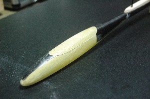 ポッドの補強。 最終的の塗装しますので色違いは気にせずにカーボン補強。 離型の為に入れたカット部分に増し貼りします。 |