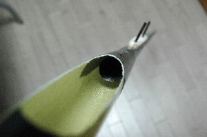 エレベーターリンケージは内径0.5ミリ外径1.0ミリのマイクロカーボンパイプを内装します。 水平尾翼の取付け位置にマイクロカーボンパイプを取り出します。 |