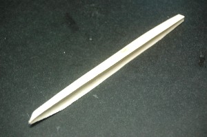製作着手前は、相変わらず、主翼を脱着式にするか接着するか悩んでいましたが、ヘビーな主翼ができた時点で接着方式に決定。 今回はパイロン方式に!と考えを巡らせていましたが、強度の不安もあるので台座と併用することに。台座は主翼揚力を最大限発揮させるよう、なるべく細く・・と重いながらも強度に不安があるので巾は12ミリにしました。 ブームにペーパーをあててブームに沿うように削ります。上面も主翼翼型の下面にぴったり合うように削ります。 重量は約1.5g。 |