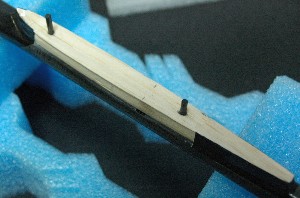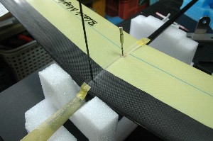 ネガティブコアでベッドを作り、翼端を必要な高さ(90ミリ)持ち上げておきます。 30分硬化型エポキシ接着剤を付け、ハードポイントを挿入した後、裏面の接合部をセロテープで止めて口が開かないようにしておきます。 樹脂が半硬化の内に左右に捻れがないかチェックを入れて、硬化を待ちます。 |