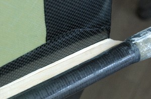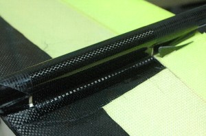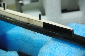 いよいよ主翼を取付けします。台座と主翼の摺り合わせが完全ではないのでカーボンロービングを噛ませて接着。 摺り合わせが完全ではない部分もブリッジになってくれます。 |