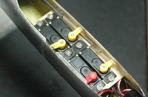 リンケージワイヤー にはダダリオギター弦PL-016を使用。 水平尾翼ホーンには0.5ミリFRP板を使用しています。 |