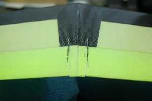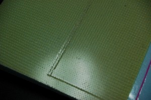サーボを付ける前にポッドの補強。 ポッドを塗装仕上げにしましたが、良く考えると壊れると補修が大変なことに気が付きました・・・遅い。 ポッドでクラックが入り易いのは開口部の角の部分。アラミドで補強を行いました。 |