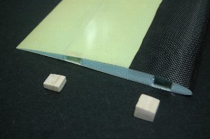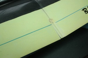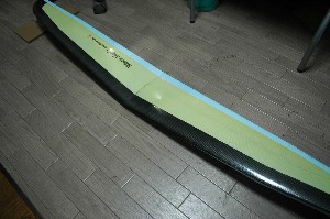 裏面 接合部を92gカーボンで補強。 エルロン部分は避けて貼りました。 上から、フィルムを載せてスポンジをかませて圧締してます。 |