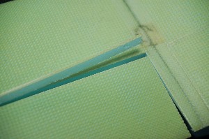主翼を接合してしまうと、ヒンジカットがやりにくくなります。かといって、先にカットしてしまうと、接合時に左右の捻れを確認しにくくなります。 なのでこの段階でカッターを入れましたが、後縁はくっついたままにしてあります。 |