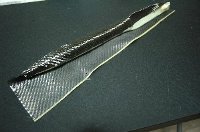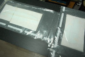 バギング完了しましたが、大失敗!! 2.7oz(92g/m2)のカーボン2重貼り(一部3重貼り)にしたのですが、ところにより樹脂が一番裏のアラミドに達していません・・・樹脂不足です。考えてみれば、 この重ね貼り状態で一気に樹脂を染込まそうという時点で少し無理がありました。 (キャノピーの切り抜き加工をする上で、1層ずつのバギングはできない関係上一気に積層しました) それだけならまだしも、カーボンクロスにシワがよっています。表層1重だけかと、カッターでそぎ落としてみると、全層がシワ!削った部分に穴があいてしましました(TmT) 198gのカーボンクロスを取り寄せて、また一からやり直しします。 |