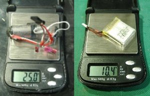 私の機体は280g近くあり、これは致命的です。 バッテリーはメンテナンスが楽なCR2を使用していましたがこれがスイッチやコネクター含んで25g。 軽量化の為、1S 400mAh(11g)リポにこれで14gの軽量化。 これで253gになりましたが、ノーズに5g程度のバラストを積みましたので、最終的には260g程度になりました。 でも、220〜230gの機体と比べると全然重いです。 |