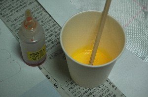3枚目の製作です。 スタイロの色があまりにも青々しいので主翼のアラミドの色に馴染むよう「黄ばみ」を入れることにしました。 東急ハンズの樹脂コーナーでは樹脂に混ぜる染料が販売されています。そこで思いついたのがプリンターの詰め替えインク。 エポキシ5gにプリンター詰替えインクを2滴落としただけで写真のように卵の黄身状態になりました。これでも仕上がりは下の写真のように僅かに黄色くなる程度です。 |
