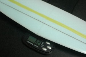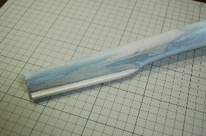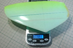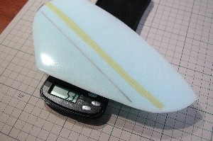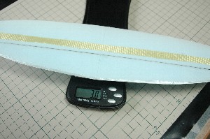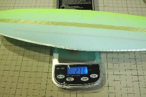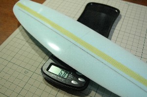 水平尾翼は6.8g。 今までで一番きれいに出来ましたが、残念ながら重量オーバー。クロスの樹脂は絞ったのですが、調子に乗ってコアに樹脂を乗せすぎました。また、カーボンの補強スパーを入れる際エポキシ接着剤をたっぷり塗ってしまったのもNGでした。 作り直すことにします。 |