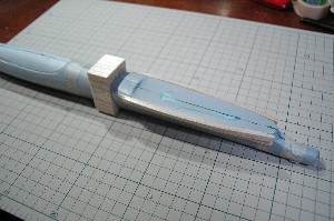 主翼とブームを直付けにすることで軽量化が可能ということで、当初はブームに直付けにするつもりでしたが、メンテナンス性からは、ビス留め方式に軍配か? SuperGeeで使用したPODの雄型を活用してPODの製作に取り掛かります。まず胴体を真っ二つにしてバルサを挿入。(かなり滑稽な写真です)主翼前縁から先端までの長さを25ミリ程度伸ばし、255ミリにしました。勿論、後ろが重たくなるのを防ぐ為です。その他あちこちにスクラップバルサを”切った貼った”で改造を加えます。 |