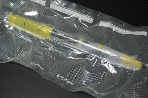 で、バギング完了。 バギング中は樹脂でベトベトなのでカメラを持つ気になれません(-_-;) グラスは0.7oz(25g/m2)のマイクログラス 硬化までの間、バッグのカールによって、反りなどの悪影響が出ないか心配です。クラークYで作ったときは、平面を下にして上に重りを載せましたが、今回は準対称なので余計な力を加えずにテーブルの上にバッグを載せてセロテープで伸ばして硬化を待ちます。 |