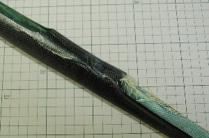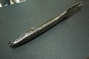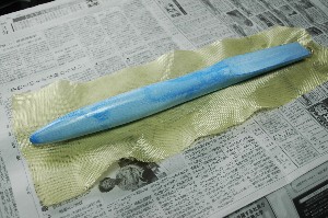 PVAを塗った後、(写真撮り忘れました)型に55スプレーを吹き付けます。これに1.0oz(35g/m2) のアラミドクロスを巻きつけます。 重ね部分に77を吹き増して納めます。 |