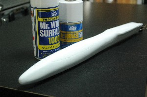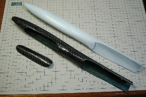 サンディングの後、サーフェイサー#500で目潰しして概ね形を整えた後、#1000のサーフェイサーで仕上げます。その後、ブルーワックスを数回塗って下地完成です。 今回は反転型を作らず、この雄型に直接カーボンクロスを巻いて、バキューム成形します。そして半硬化時点でカッターで最低限の切開しておき、硬化後に型を取出す方法をとります。(H師匠からの伝授、この方法は工数が半減できます。素晴らしいアイデアです) |