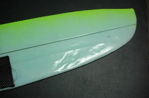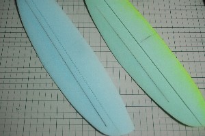 写真右が今回の染料入り。この方法は塗布量によりムラがでます:コアに塗る樹脂に同じものを使うとそこだけ濃くなります。なのでインクなしの透明な樹脂を別に準備して、コアに塗る樹脂はそれを使用しました。(芸が細かい!) インク方式だと、重量が増えないのはいいですが、僅かに黄色くなる程度ですので「着色」するには相当量のインクを混ぜる必要がありそうです。(樹脂混入用の染料は10%位までOKと書いてありましたので5gのエポキシにmax0.5gまでいけそうですが試していませんのでご参考まで) ※動翼部の黄色はコアに予めスプレーを吹いたものです。スプレーは目立って良いですが、重量が気になります。 |