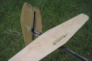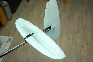それから、簡単に作るために、垂直・水平尾翼は2ミリバルサを使用していました。また、この方が空気抵抗が少ないだろうと考えていたのですが、板翼ではランチ時に空気が剥がれてしまい、かえって抵抗が大きいとの話を聞いて、翼型翼に作り直し。 同時に修理で重くなっていた尾翼をシェイプアップ。これで5gの軽量化。 |