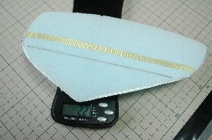 で、気を取り直して再製作。バギング前が2.6g、完成重量6.2gこれなら合格です。(でも美しさでは1枚目の方がキレイ) 垂直尾翼+水平尾翼で12gが目標のところ、今回は垂直尾翼+水平尾翼で11.5gですので、これに補強板やホーンを付けると全備重量はちょうど12g位になると思います。 |