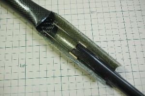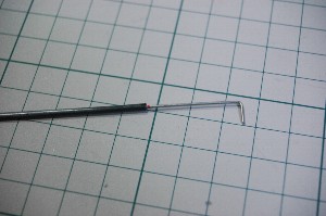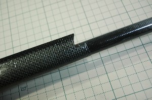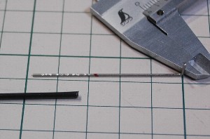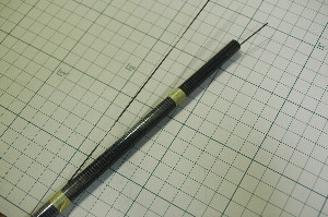 そこで、カーボンパイプに0.9ミリのピアノ線を差込んで瞬間で接着することに。 これ、グッドアイデアです。カーボンロッド端にピアノ線を添えてくっつける手法は接合部に段差ができるのでその部分が「引っかかり」となるので狭い部分では干渉する可能性があります。でもこの方法は引っ掛かりが無くとてもスムーズ。また、この方法は長さの調整が簡単なのもGOODです。 念のため、ピアノ線にはミニルーターで傷をつけておきました。 重量は1本で1.2g。 |