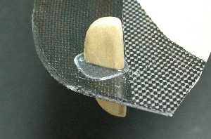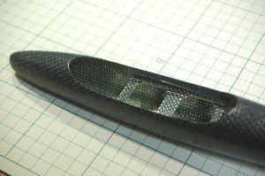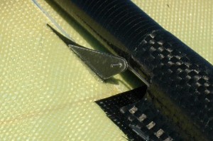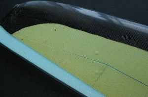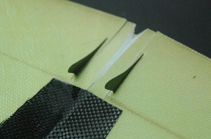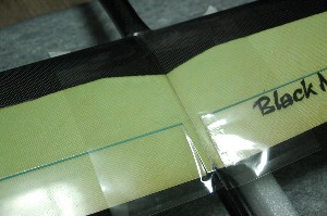 続いて、ダメだしです。 1)不覚にもヒンジラインに鉛筆で濃くケガイていたので鉛筆の粉が樹脂でにじんでいます。(かっこ悪るぅー) 2)ローラーで押さえる際に力が入りすぎたか、せっかくきれいに揃えたアラミドのラインが乱れています:アラミドが「しましま」になってしましました。(これもかっこ悪るぅー) 以上、どうしようもありません。まあ、飛行性能には大きく影響はないだろうということであきらめます。 |