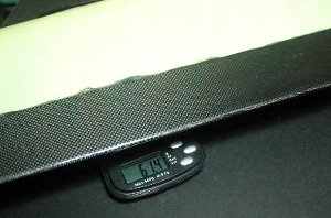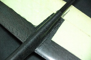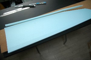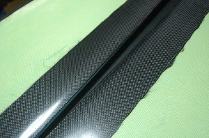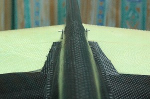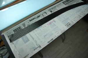 マイラーシートに引いたラインに沿って、2.7oz(92g/m2)のカーボンシートを置きます。 カーボンシートの巾は翼根部で60ミリ、翼端部で45ミリです。 カーボンシートはマイラーシートより若干(7〜8ミリ程度)はみ出すようにします。このはみ出した部分が前縁に巻き込まれる部分となります。 |