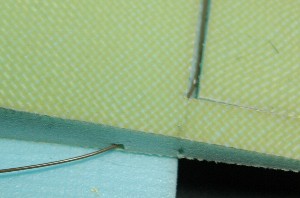 調子に乗って、アンテナを主翼内蔵式としました。(Black Magicで試行された方法です) 今回、左右翼の重量差が解消し、重量合わせとなりますし、 空気抵抗も減らせます。 ヒンジカットが凹型なのでヒンジの底部にアンテナラインを仕込んでも動翼の動きのジャマになりません。内蔵するにあたり、テトラのワイヤーリンケージのワイヤーを使用しました。ワイヤーをエポキシで点付けしました。 |