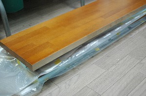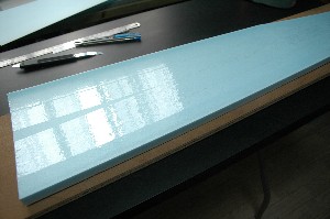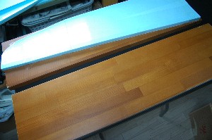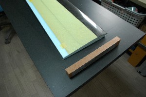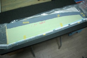 さらに真直ぐな主翼を作る為に、ネガシェルを板(集成材)に貼り付けて万全を期そうとしましたが、最終的にバッグにいれてバキュームする際、うまくいきませんでした。 角張った形状なのでフードセーバーのバキューム圧が不足するせいか、角で穴があいてしまうせいか、シールがうまく行きません。何度もやり直しました(バッグをいくつも取替えてトライしました)が最終的に板を同時にバッギングするのはあきらめました。 |