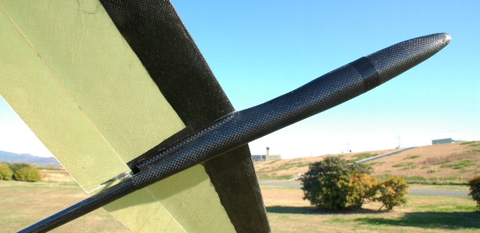 ポッドにブームを接着。 有害抵抗を減らす為に、リンケージは内蔵方式。予めロッドガイド(マイクロカーボンパイプ)をブームに仕込んでおきます。 ※マイクロカーボンパイプは外径1.0ミリ内径0.5ミリなので0.42ミリのギター弦がちょうど内蔵できます。 今回は主翼を直付けすることにしましたので、主翼を接着すると、この部分は作業ができません。仕込むべきパーツはこの時点で仕込んでおく必要があります。エルロン用のマイクロカーボンパイプも含めて全部で4本仕込んでおきます。 |
