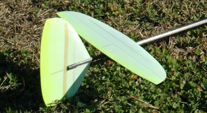翼端は超薄翼となっています。ペグ根元部分のめり込み防止の為、0.5ミリのFRP板をベースに接着しておきました。 |