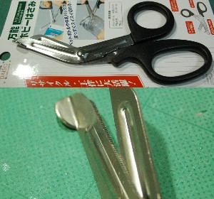余談ですが、アラミドのカットには専用のはさみが必要と思いきや、刃がギザギザなものなら代用できるということをH師匠からお聞きし、100均で探してみました。 「万能ホビーはさみ」なるものがあり、刃がギザギザになっています。このはさみを試したところ何とか使えてます。 ギザギザは片面だけで、もう片方はふつうの状態。こいつをやすりでギザギザに荒らしてやることで、切れ味をキープすることが出来ます。 ちなみにH師匠曰く、鉄製のものが良いとのことですが、残念ながら100均ではステンレス製のはさみしか売っていませんでした。 |