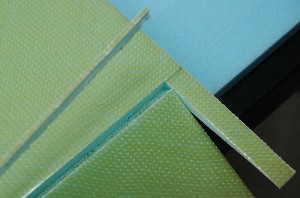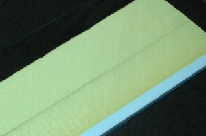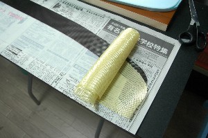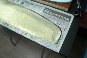 今回、アラミドを初めて扱うのでいろいろとアドバイスを頂きました。 まず、カットする前に、碁盤の目を引いたボードの上にアラミドクロスを広げ、繊維の縦横を念入りに揃えた上で、型紙に沿ってバイアスに丁寧にカットします。 ※アラミドの織り目がねじれていると、最悪の場合、硬化時にねじれが発生するとの話を聞きました。 ガラスクロスで直貼りする場合、マイラーシートにガラスクロスを乗せて樹脂を塗った後でクロスの余分をカットしますが、アラミドの場合はここでカットして終わり。 縦横の網目が崩れないように巻き取っておいたものを、マイラーシートの上にそっと転がしながら乗せてやります。この際、アラミドを引っ張って伸ばしたりしないように注意。 アラミドの前縁側はカーボンクロスより若干控えておきます。 |