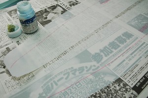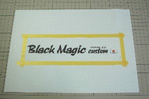 いよいよ表面のバギング。 H師匠にBlack Magicの使用許可を頂いて「Black Magic custom」とネーミングしました。 A4コピー用紙にティッシュ(2枚重ねタイプを剥がして1枚にする)をマスキングテープで貼り付けてプリンター印刷。ティッシュの巾が広いとシワになりますので7〜8センチ以内にします。また、プリンターのローラーがある部分はティッシュが破れてしまいます。試行錯誤の結果、中央部だと破れにくいことが分かりました。(Canon pixus Ip4500使用) これに55のりをごく軽く吹いて、マイラーシートに貼り付けてバギングします。 |