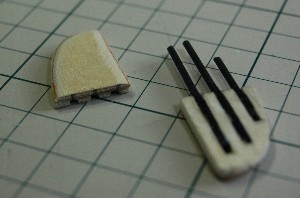 ペグは、1.5ミリ航空ベニア+2ミリバルサ+1ミリバルサ 1.5ミリ航空ベニアに2ミリバルサを貼った後、ロッドの溝を掘って(左写真の状態)その上から1ミリバルサを貼ります。(写真は1ミリバルサを貼る前の状態) 心棒は1.6ミリカーボンロッドx3本 |