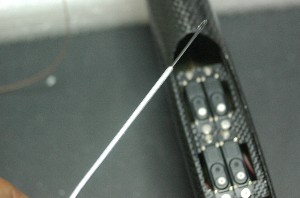 ポッド内に瞬間接着剤で仕込んだマイクロカーボンパイプを取り外す必要があります。さてどうするか?? 以前に雑談でブーム内に瞬間接着剤で接着したマイクロカーボンパイプを外すにはどうしたら良いか?という話があって、真鍮パイプを突っ込んで外すという話を聞いたことがあります。 手元にアルミパイプがありましたので先を研いでマイクロカーボンパイプに突っ込んでぐりぐりとやると、みごとに「バキッ」と音を立てて外れました。めでたし、めでたし。 |