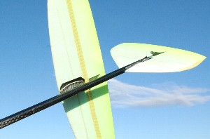 エレベーターの台座は、スタイロフォームに92gのカーボンを巻いて製作。重量は0.6g マイクロカーボンパイプは水平尾翼の台座の中を通します。リンケージのギター弦が台座から出てきますので、ホーンを水平尾翼台座の真後ろに配置でき、後流に入るようにできます。 これらもBlack Magicで採用されている方式です。 |