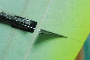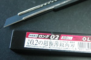 エルロンのヒンジカットを行います。 建築プロショップで、OLFA 0.2ミリ超極薄刃を発見しましたので早速購入。クロス工事用の極薄刃カッターです。 今まで、コアをカットする際、引っ掛かってボソボソになることがありましたが、この刃(薄刃)だと引っ掛かりが防げます。 |