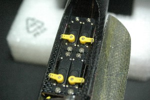 サーボのレイアウト状況。すっきりと納まりました。 メカ搭載+バッテリーうを含む全備重量は222gとなりましたが、かなり後ろ重心ですので10g以上のバラスト搭載が必至の状態です。 とりあえず8gを搭載して、あとは現場で調整することにします。 |