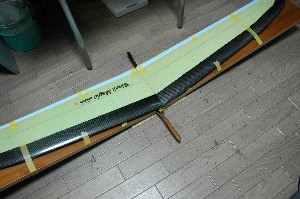 続いて、主翼上面の接合部の補強を入れます。カーボン部分は92gカーボン増し貼り、アラミドの部分は26gグラス2重貼り仕様。(すこしでも軽量化する為) クロスを置いて樹脂をのせたあと、PPの書類袋を載せ、この上からスポンジを置いた上に重しを置いて24h養生。 これで表面がピカピカになります。 |