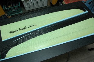 | 「Black Magic custom」の製作 その2 です。H師匠曰く、「普通は主翼から作りますよ」・・ でも、私はPODと尾翼から作り始めました。そして、いよいよ主翼の製作に入ります。アラミドの扱いはグラスとはかなり 勝手が違うので、知識なしで行うのは難しいと感じました。これからアラミドを扱ってみようという方は、 先人のノウハウを入手してから着手された方が良いと思います。 |