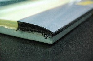 その後、カッター刃の背を使って底部をかき取るように剥がします。 底面にはアラミドのみが残り、適度な弾性が確保できます。 |