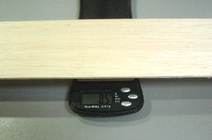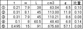 翼面荷重10g/dm2を目指すと45g以内に納める必要があります。バルサはなるべく軽いものを集めました。まずはバルサの重量測定をして、比重を割り出します。 比重0.1以下のバルサが「軽い」バルサですのでC以外はすべて合格。 |